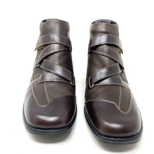 European leather combination pull-on wedge bootie with unique toe pattern piecing and adjustable crisscross strap.