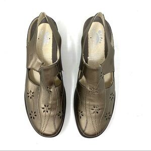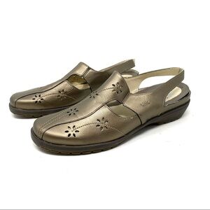 This soft leather sling back is designed for comfort. Punch cuts, leather sock lining and goring combine to make a shoe that offers support and flexibility along with wonderful breathability. Polyurethane foam outsole is durable and complete the total comfort experience. Removable insoles.