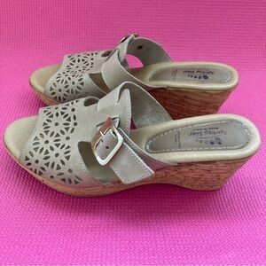 Spring Step Beige Leather Cork Slide Perforated Wedge Sandals Italy Sz 8.5