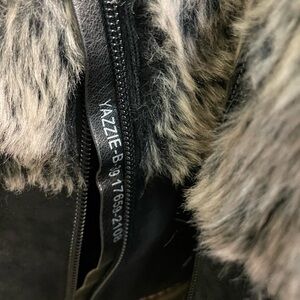 Stylish black ankle boots with cozy faux fur trim. Perfect for cold weather. Comfortable wedge heel.