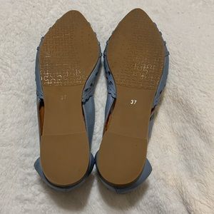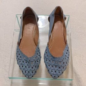Stylish blue flats with intricate cut-out design. Comfortable and chic.