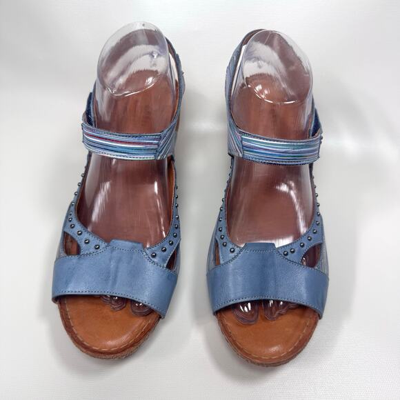 Spring Step Blue Stud Striped Ankle Strap Sandal Wedge Artsy Boho Lightweight 41