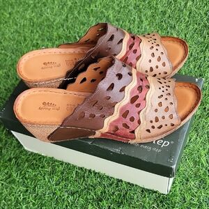 Spring Step brown cutout wedge peep toe sandles with pillow top cushioned footbed for all-day comfort.