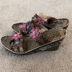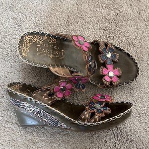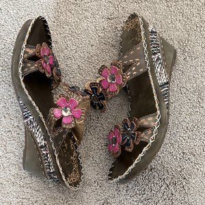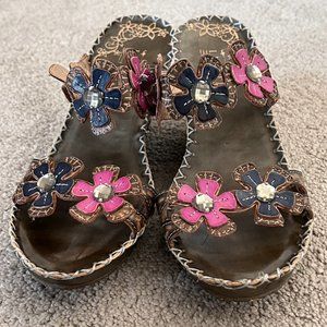 Charming Spring Step sandals with floral accents. Features brown base with pink and blue flowers. Comfortable wedge heel.