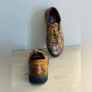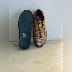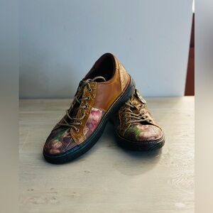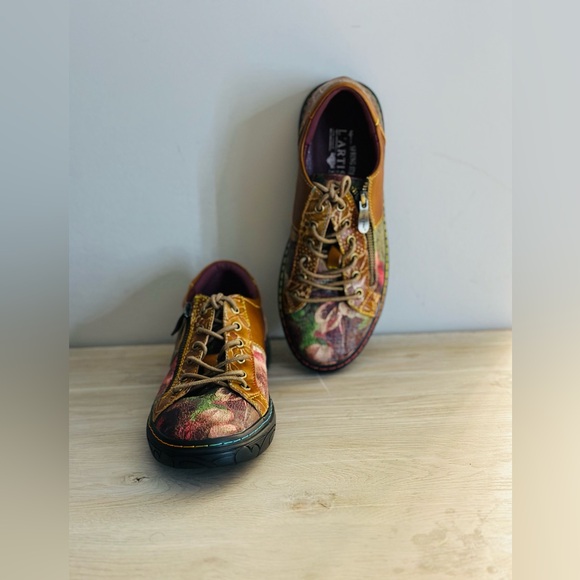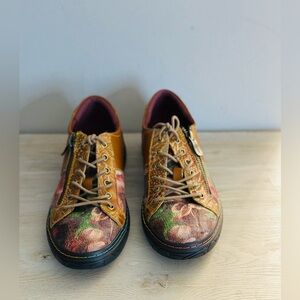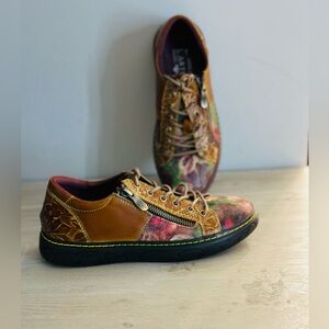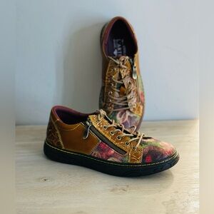 Women's L'Artiste by Spring Step Danli-Bloom Shoes are a French-inspired sneaker with hand-painted and embossed details, metallic rose printed textile accents, and an adjustable lace-up closure with metal eyelets and zipper. Reviews note that these shoes are comfortable, stylish, and have a perfect fit, but some say they are a bit small and narrow.