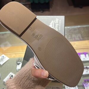 Cute little slide. Giant flower in white. All leather. Slight heel on bottom, other wise flat.