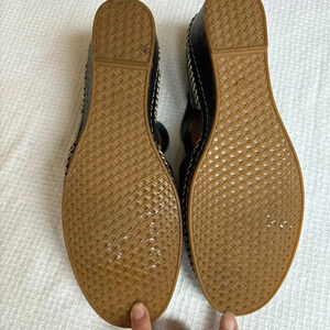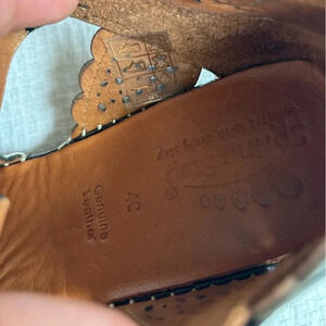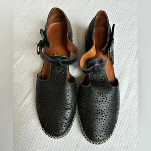 Spring Step EUC Black Leather, T-Strap Mary Jane Wedges with White Threading