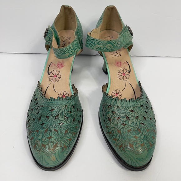 Chic green floral heels with intricate cut-out design. Comfortable and stylish for any event.