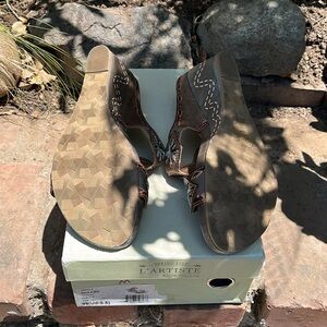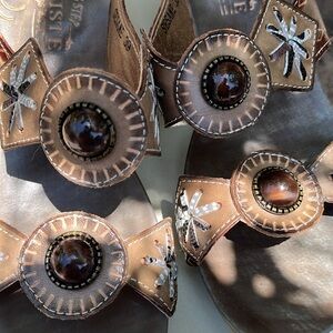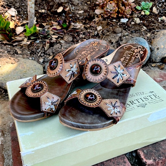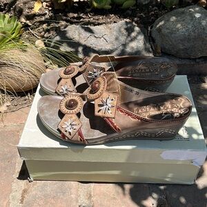 These wedged sandals are from Spring Step they are leather and the color on the box says gray but are more of a brown color . They feature a 2 straps adorned with 2 faux stones in the middle of the strap and a kind of flower motif on each side . The wedge has some detail on it as well there are also some diamond shapes around the shoe . It’s very beautifully made. The shoes are brand new and have never been worn and kept in the original box.