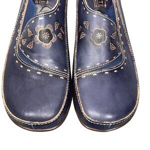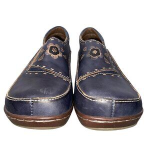 These Spring Step L'Artiste slip-on shoes are crafted for women who appreciate both style and comfort. The navy blue leather is beautifully enhanced with floral embroidery, adding a touch of elegance to any casual outfit. Designed with a slip-on style for easy wear, they offer a comfortable fit for everyday use.