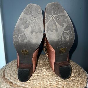Distressed Brown Leather and Embroidered Boho Patterned Western Style Boots. 2.25” Heel. 10” Shaft. Size Chart in Photos