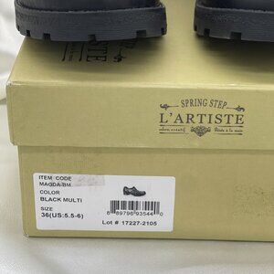 L'ARTISTE Style: MAGDA Quality leather shoe with a textured textile and hook and loop top strap on a flexible lug outsole.