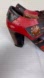 Leather ankle bootie features color-blocking in red, brown, and black. Booties have elastic goring for easy fit, and hook and loop strap across front of foot. Strap has beautiful decorative button. Almond toe, three inch stacked wooden heels have leather accents on them. Lots of whip stitching.