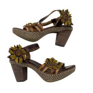 Spring Step Lavish Floral Applique Leather Block Heel Sandal Brown 37 / US 6.5