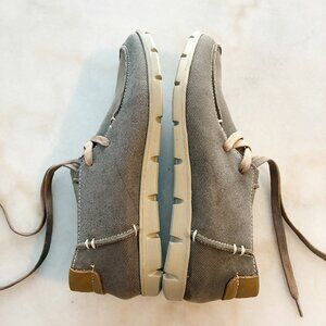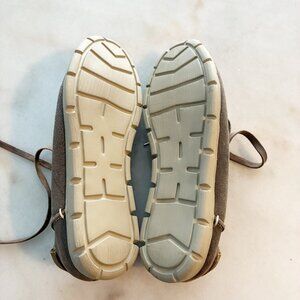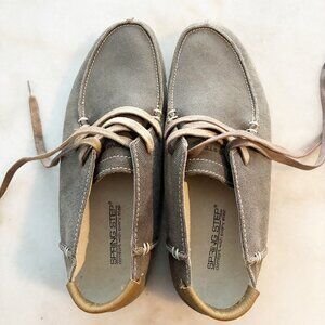 Spring Step Men's Taupe/Brown Lace-up Boat Shoe Size 44 (US 10.5-11) Not sure of the uppers- look like textured leather (very soft), leather lining, rubber outsole, and lace closure. Super lightweight! Hand stitching and heel trim. Note: They were sold as seconds- the taupe/brown color of the shoe bleed onto the tan laces- creating kind-of a tie-dye lace- other than that, they are in very good condition.