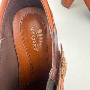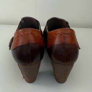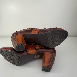 Chic heeled boots with a multicolor design. Features rich leather and unique stitching. Velcro closure. Heel is sturdy and sole is in great used condition.