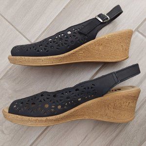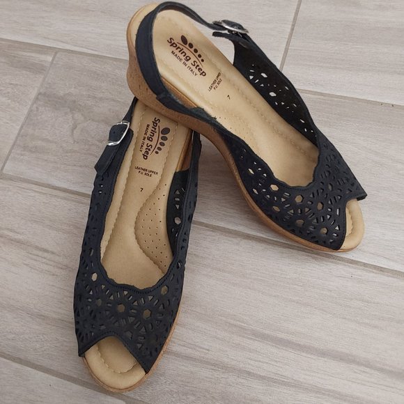 Spring Step ORELLA Black Leather Cut Out Sling Back Wedge Sandal. Size 7