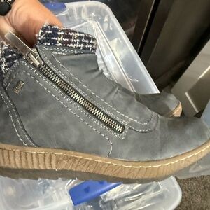 Spring Step Relife Cleora Boots. Women's size 6.5-7 (EU 37)--size chart included. Stylish blue-gray ankle boots featuring a side zipper and textured sole. Perfect for casual wear.
