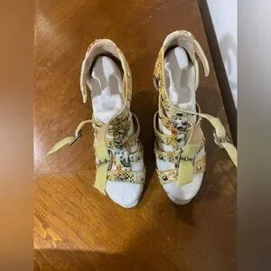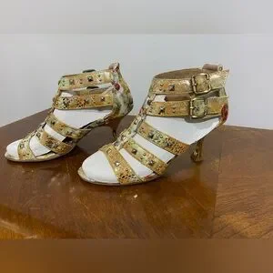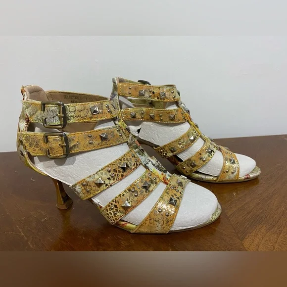 Spring Step L’Artiste Delectable strappy sandals, close back, stud embellishments, inside elastic and hook and loop closure on the top two straps, shiny gold heel