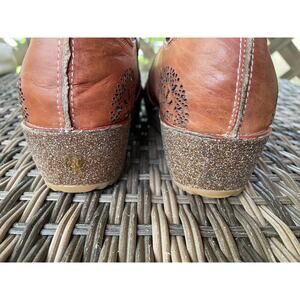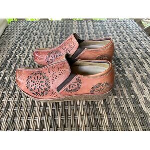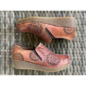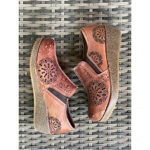 Chic tan mules with intricate laser-cut design. Comfortable wedge sole. Ideal for casual wear.