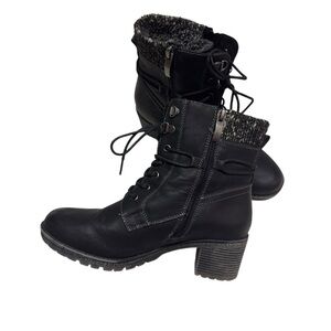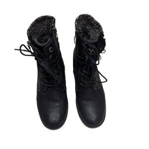 These Spring Step combat and moto boots feature a sleek, minimalist design in solid black, perfect for versatile styling. Crafted with a rounded toe and lace-up front, they offer both comfort and a classic look. The ankle-height silhouette and flat sole make them ideal for everyday wear.