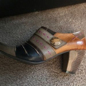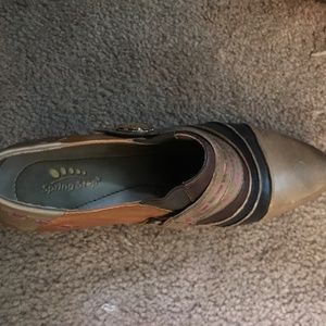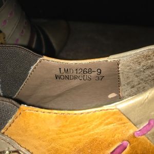 I believe these are leather. Almost new condition. Very comfortable and great for walking. Nearly new condition- I’ve only worn these a handful of times. The button is actually attached to a strap which you can use to adjust the support along the top of your foot. Size 37.