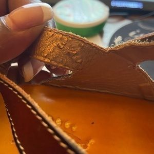 Brown red green and orange Spring Step sandals, size 36 , I think that is 5.5 in the US. Inside of shoe has some peeling but wont be noticable if shoes are on and barely when off..