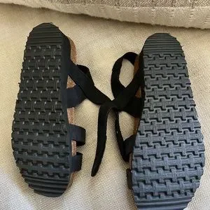 Cute black suede sandals with adjustable Velcro ankle strap. Cork sole. Soft footbed. Never worn.