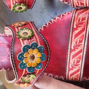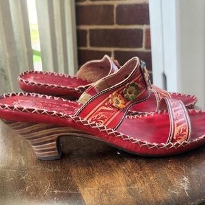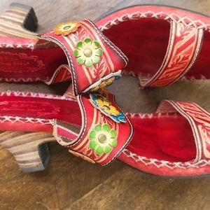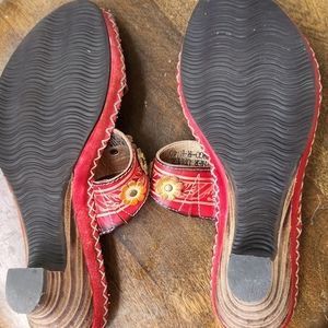 These are in solid EUC. Red leather with turquiose, orange and green embellishments. The stiching detail is in cream. Really comfortable with a 2 inch heel.Also, please be sure to check your size with Spring Step sizes. These are awesome!