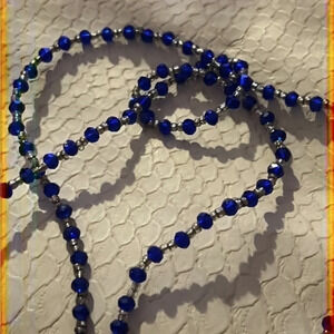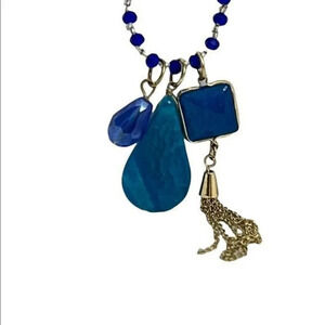 Blue and teal stones with gold chain accents. Long 17” necklace with gold tone clasp. Great condition with no flaws