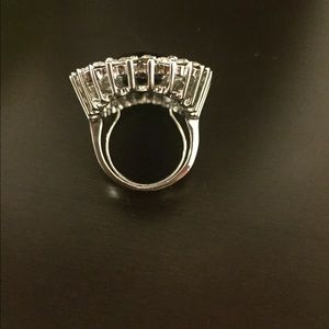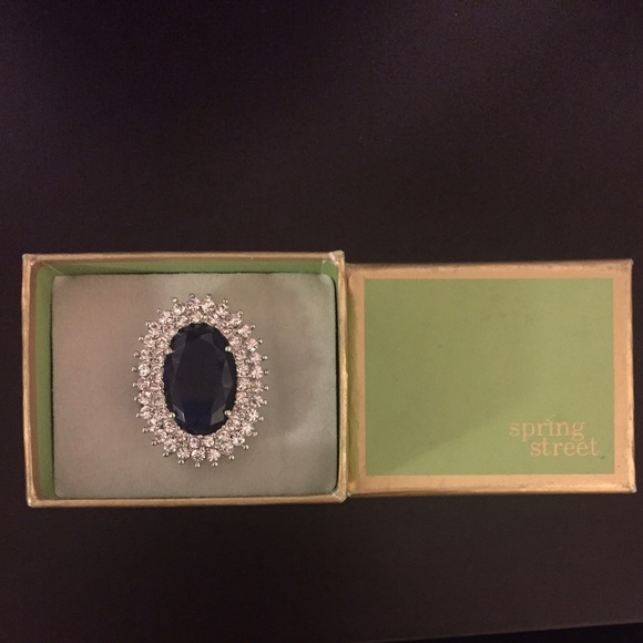It has a big sapphire diamond in the middle surrounded by other smaller diamonds. It is an oval shape and fits most sizes. Made just like princess Diana silver engagement ring.