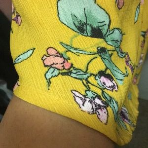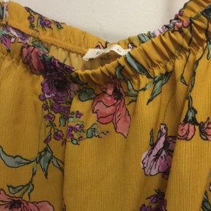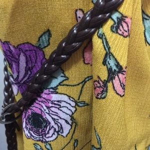 A lovely spring/fall off the shoulder dress gold white flowers printed on it with a brown braided slim belt☀️☀️