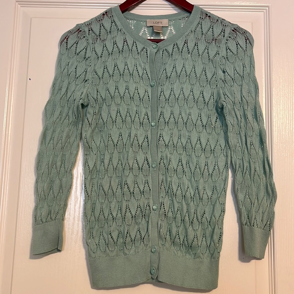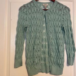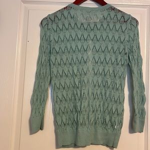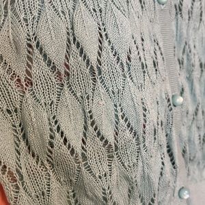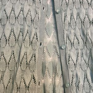 Dusty blue loose knit, lightweight cardigan looks like lace and is like brand new! 3/4 length sleeves for spring weather. Perfect topper for sundresses and tanks too! Wear buttoned or not;)