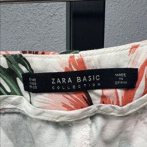 Fun cute floral pants from Zara Basic. White base with green leaf and coral floral print. Casual and feminine style. Unsure of material as the information tag is cut. Love these but don’t fit in them anymore