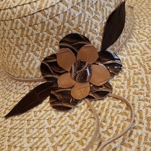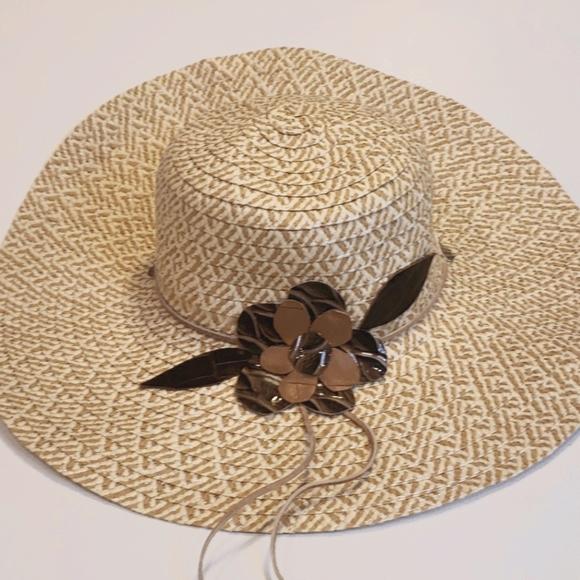 Beautiful, delicate Women's Floppy Straw Hat Wide Brim Foldable , adorable for the beach Sun Hat - Brand New - with a leather hand cut flower design -