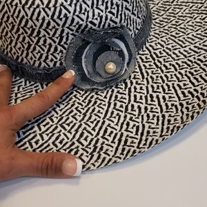 Beautiful, delicate Women's Floppy black & White Straw Hat Wide Brim Foldable , adorable for the beach Sun Hat - with a hand Jean's flower design - Brand New