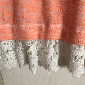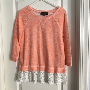 Lightweight light orange spring sweatshirt with lace ruffle.