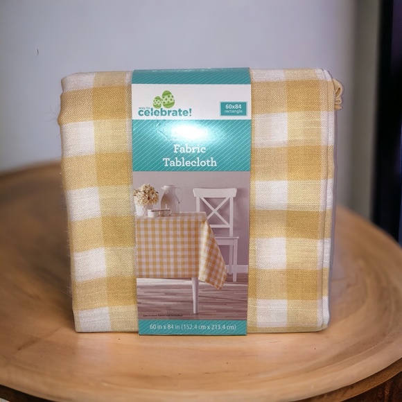 New yellow and white check table cloth. Easy clean up polyester. 60” x 84”