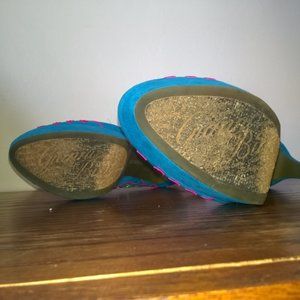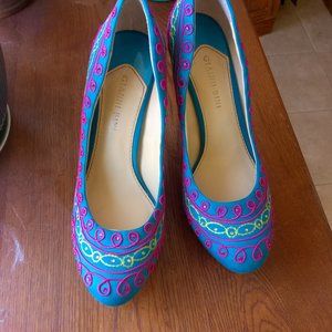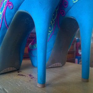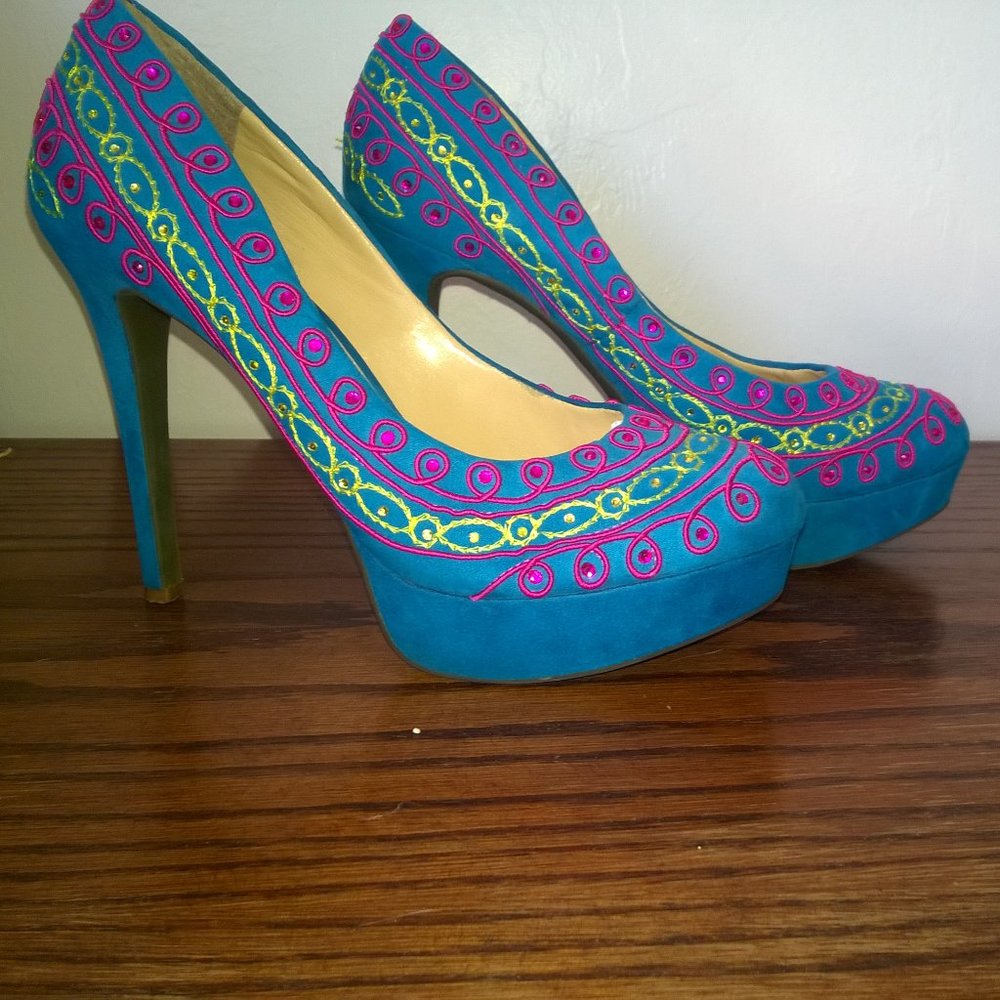 Perfect for Spring! These heels are ready to wear with a pair of jeans or your favorite spring skirt. They steal the show in torquoise suede with pink and green embellishments. Excellent condition. They boast a 5" heel with a 1" platform. Size 8.5 Gianni Bini