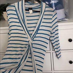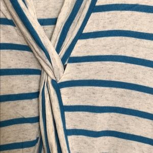 3/4 sleeve striped light weight top. Deep V neck and knotted front so would need a cami underneath.