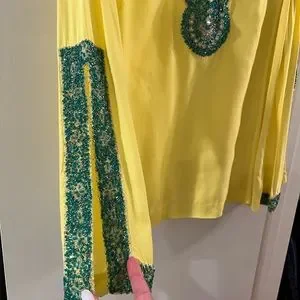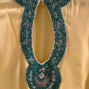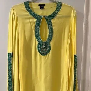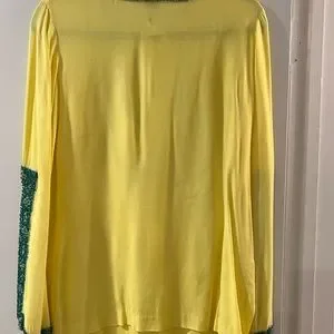 Beautiful yellow top with stones around neckline and sleeves. Eyelid close at top, very classic and great for a night out