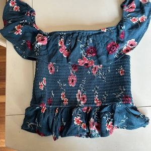 Adorable top can be worn off the shoulder, teal with floral pattern