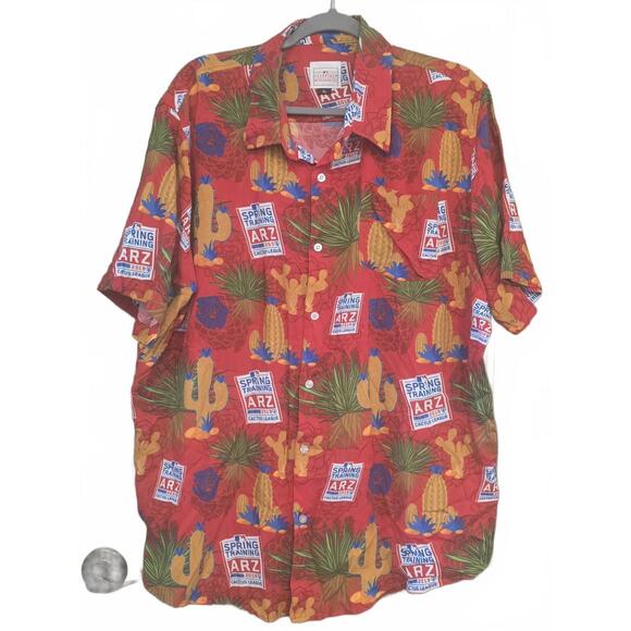 Official MLB Spring Training Hawaiian shirt. Size is XL. Red Cactus league. Arizona. Get ready for a sunny day with this vibrant short sleeve button-up shirt featuring a unique cactus design! Perfect for casual outings, beach days, or spring training events. This eye-catching shirt showcases a playful pattern of cacti, tropical foliage, and bold prints, seamlessly blending comfort with style. Made from lightweight fabric, it promises breathability and ease of wear. Great for layering or wearing alone. Ideal for those who love a bit of flair in their wardrobe!