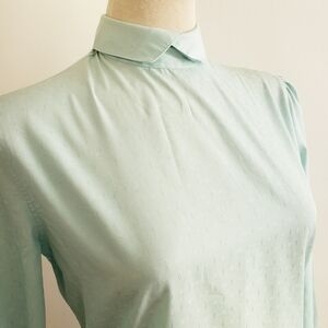 Bright and Cheery light teal blue pastel shirt / blouse that buttons down the back with a high neck and fold down rounded collar. A very smart looking classic shirt called the