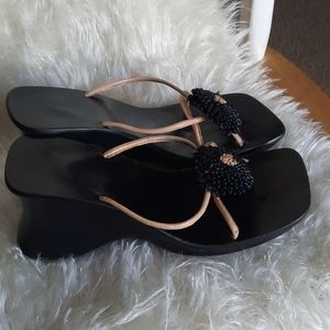 Super Cute Spring wedge sandals. They are black & tan They look super sexy on with lots of cute outfits. There in good condition. There's no name brand left on the shoe. The bottom of the right foot has a piece of the sole missing. Show pic 4.