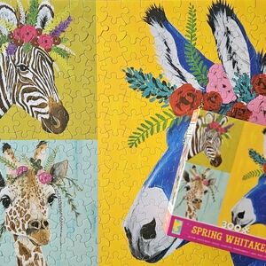 Colorful animal puzzle featuring a zebra, giraffe, and donkey with floral crowns. Perfect for puzzle enthusiasts.