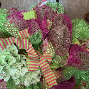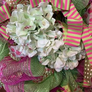 Green and pink wreath with hydrangeas approximately 24in. Handmade
