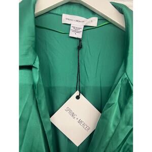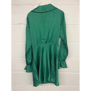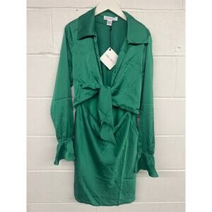Spring and Mercer Sz L Emerald Green Long Bell Sleeve Satin Tie Front Mini Dress
