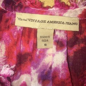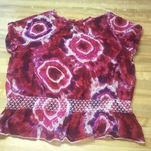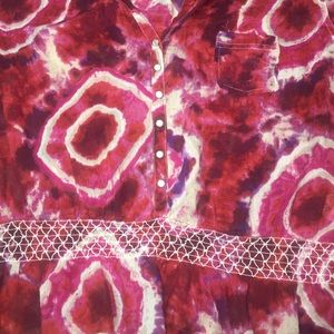 Red/purple and white blouse. Has a ruffle on the bottom and buttons down the front. Stain and smoke free. Size Small