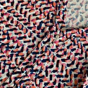 Pretty spring colors of pink,coral,white and navy pattern. V neck with 3 faux buttons down the front. Hem is shark bite. Longer in sides. No rips stains or tears.
